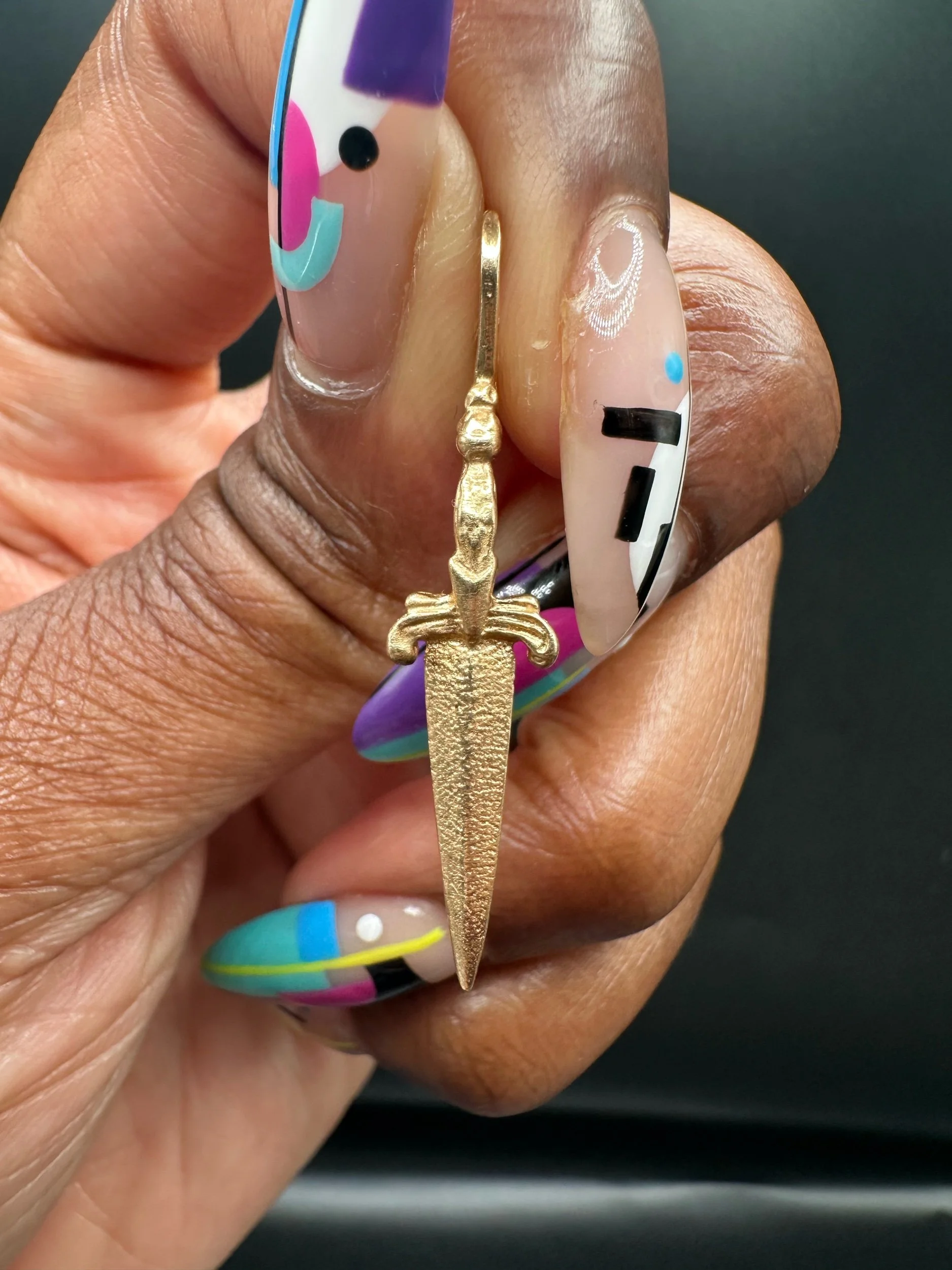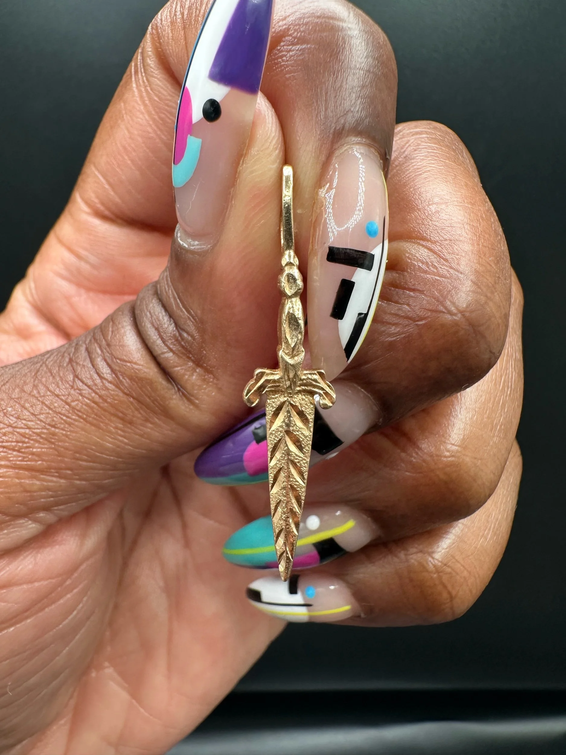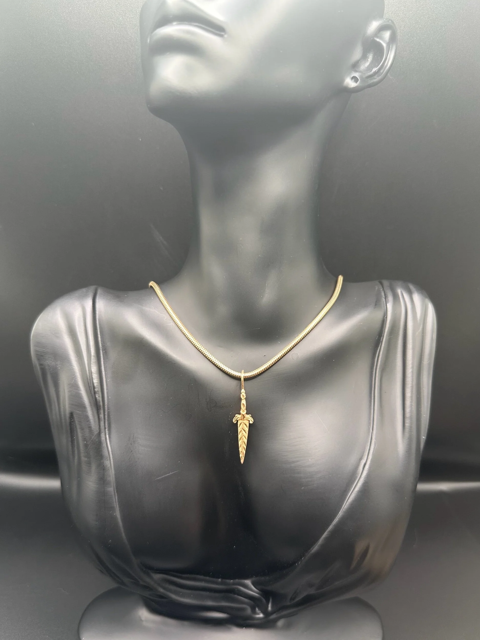 A striking vintage 14K gold dagger charm by Michael Anthony, known for producing finely crafted gold jewelry with distinctive detail and enduring quality.