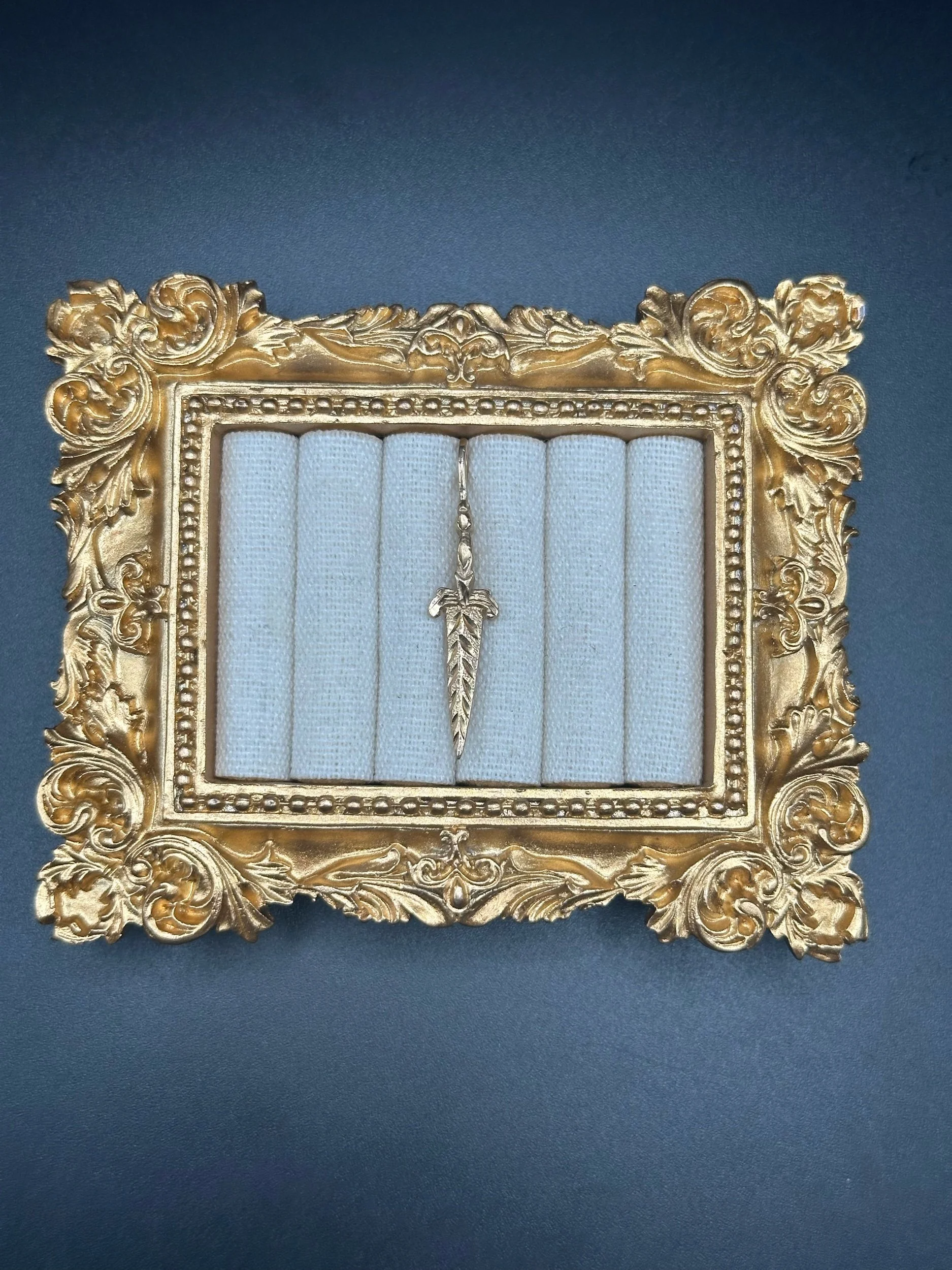 This piece features a sculptural dagger silhouette with textured blade detailing and dimensional hilt work, giving it a strong presence despite its compact size. The design is fully finished on both sides, allowing it to be worn in either direction.